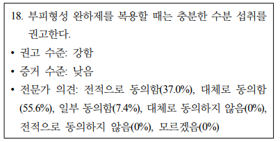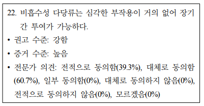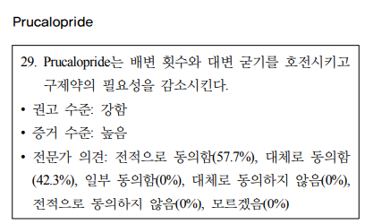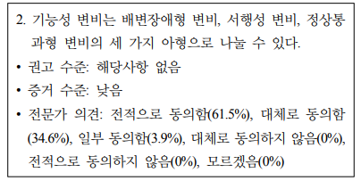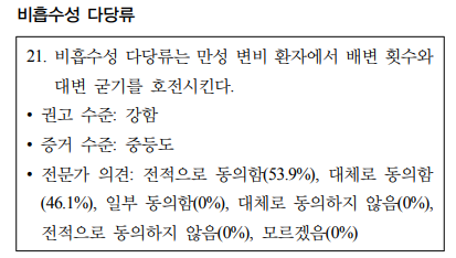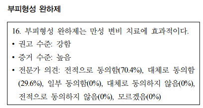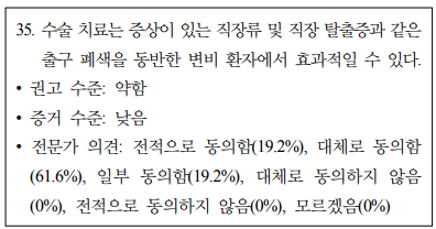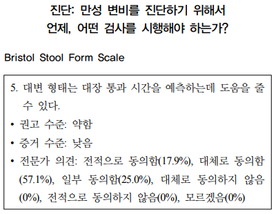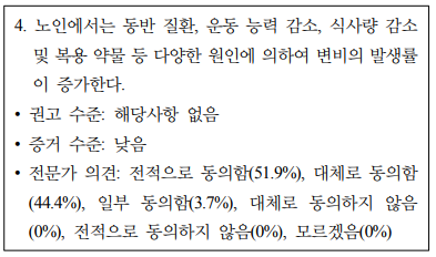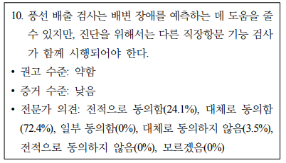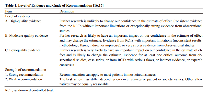 개정된 임상 진료지침의 특징은 첫째, 과학적이고 객관적으로 근거를 평가하기 위하여 체계적 문헌 검색과 근거 평가를 시행하였고, 둘째, 진료지침 개발 방법으로 수용개발(adaptation) 방법을 이용하였다. 수용개발 방법은 일부 국내의 연구 근거가 제한적이고 양질의 근거중심 진료지침들이 이미 개발되어 있는 상황에서 국내 여건에 맞게 기존의 진료지침 안을 최대한 활용하여 개발하는 방법이다[9]. 진료지침의 대상은 만성 변비에 대한 진단과 치료가 필요한 성인 남녀로 만성 변비와 연관되어 일상생활에 불편을 겪고 있는 환자들 을 포함하였다. Appraisal of Guidelines for Research and Evaluation II process [10]를 이용하여 6개의 가이드라인을 선 택하였다[6,11-15]. 이번 진료지침은 최신의 과학적 근거를 분석하고, 이를 토대로 만성 변비의 진단이나 치료가 필요한 상황에서 임상 의사와 환자의 의사결정을 돕기 위하여 제작 되었다. 근거 수준과 등급 체계는 표 1과 같다[16,17].