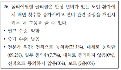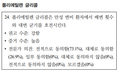 폴리에틸렌 글리콜은 65세 이상 만성 변비를 가진 노인 환자에서 안전하고 효과적인 약제로 다른 완하제에 비해 배변 횟수와 대변 굳기를 정상화시키는 데 있어서 더 효과적이다[70,76]. 폴리에틸렌 글리콜은 종종 구역, 복부 팽만감, 설사 등의 부작용이 있지만, 심각한 부작용이 없어 노인에서도 좋은 복용 순응도를 보인다.