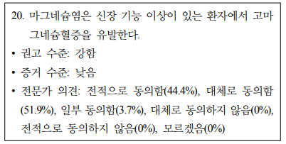 신장 기능 이상이 있거나 신경 근육 질환이 있는 경우, 마그네슘염으로 인한 고마그네슘혈증을 유발할 가능성이 있으므로 주의해야 한다[61]. 고마그네슘혈증은 curare와 유사하게 신경근육 접합부의 자극 전달을 감소시켜 신경근육계, 호흡기계 및 심혈관계 기능 이상을 유발할 수 있다. 심혈관계 부작용으로는 저혈압, 심장 전기전도 장애, 서맥성 부정맥 및 심정지 등이 유발될 수 있다[62,63]. 따라서, 신장 기능이 저하된 환자에서는 마그네슘염을 사용해서는 안된다.