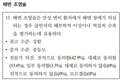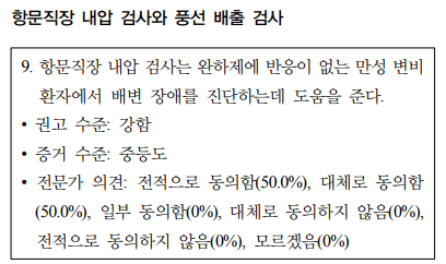 풍선 배출 검사는 모의 배변 동안 배변 기능을 평가하는 간단하고 저렴한 검사 방법이다. 아직 표준화된 방법은 없지만, 최근 연구에서는 모의 배변 동안 1분 이내에 풍선 배출이 가능하면 정상 소견으로 간주한다[41]. 풍선을 배출하지 못 하면 배변 장애의 가능성이 있으며, 87.5% 민감도, 89% 특이 도, 64% 양성예측도, 97% 음성예측도를 보인다[42]. 그러나 배변 장애를 보이는 환자의 상당수가 풍선 배출이 가능하기 때문에 풍선 배출 검사 결과만으로 배변 장애가 아니라고 판단할 수는 없다[34,43]. 풍선 배출 검사는 배변 장애를 예측 하는데 도움을 줄 수 있지만, 진단을 위해서는 다른 항문직장 기능 검사가 함께 시행되어야 한다[14].