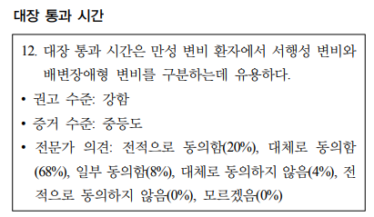 대장 통과 시간은 방사선비투과 표지자를 이용하여 측정 하는 방법으로, 저렴하고 널리 사용되고 있다. 국내에서는 Kolomark (M.I. Tech, Pyeongtaek, Korea)와 Sitzmarks (24개 표 지자; Konsyl Pharmaceuticals, Texas, TX, USA)가 주로 사용 되고 있다[45,46]. 다양한 측정 방법 중 연속된 3일 동안 일정 시간에 표지자가 들어 있는 캡슐을 1개씩 복용하고 4일째와 7일째 복부 X-선 촬영을 시행하는 방법이 널리 사용되고 있 다. 국내 성인의 정상 대장 통과 시간은 남자 22.3 ± 16.1시 간, 여자 30.1 ± 21.4시간이며[47], 대장 통과 시간은 연령, 성 별, 인종 및 측정 방법에 따라 차이가 있다. 대장 분절별 통 과 시간은 서행성 변비와 배변장애형 변비를 구분하는데 유용하고[14] 다른 기능 검사와는 달리 쉽게 이루어질 수 있어 만성 변비를 감별 진단하기 위한 초기 검사로 시행할 수 있다. 그러나 표준화된 방법이 아직 확립되지 않았고, 배변 장애 환자 중 50% 이상에서 느린 대장 통과 시간을 보이므로, 대장 통과 시간 측정만으로 배변 장애를 배제할 수는 없다. 일부 외국 진료지침에서는 대장 통과 시간 측정은 항문직장 내압 검사, 풍선 배출 검사 혹은 배변 조영술이 정상인 경우 에 시행하도록 권고한다[13]. 그러므로 임상 의사는 환자의 증상에 따라 주어진 의료 환경에서 시행 가능한 검사를 적절 하게 선택하는 것이 바람직하다.