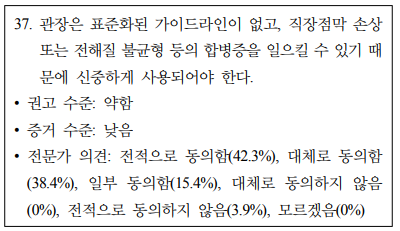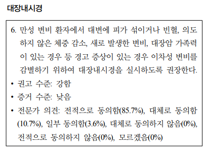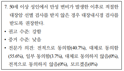 만성 변비가 있는 50세 이상 성인에서 대장암에 대한 적절한 선별 검사를 받지 않은 경우 대장내시경을 받도록 권장 한다[11,12,14,23]. 그러나 만성 변비가 있는 경우 변비가 없는 경우보다 대장암이 더 흔히 발견된다는 임상 근거가 없으므로[37] 모든 환자에게 통상적으로 대장내시경을 권장하는 것은 바람직하지 않다.