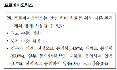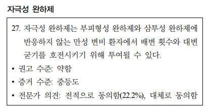 프로바이오틱스의 변비 치료에 대한 효과와 안정성을 알 아보기 위한 무작위 대조군 연구를 대상으로 한 체계적 문헌 고찰에서 Bifidobacterium latis DN-173000, Lactobacillus casei Shirota와 Escherichia coli Nissle 1917이 배변 횟수와 대변 굳기 호전에 좋은 효과를 나타냈다[82]. 프로바이오틱스의 효과는 균주 및 용량 등에 따라 다르게 나타날 수 있기 때문에 만성 변비에 대한 효과를 해석하는 데는 제한점이 있다. 프 로바이오틱스는 만성 변비의 치료를 위해 다른 완하제와 함께 사용될 수 있다.
