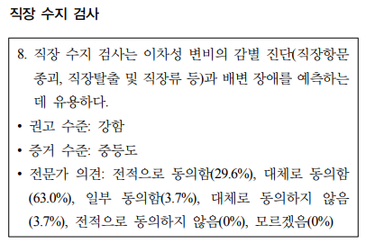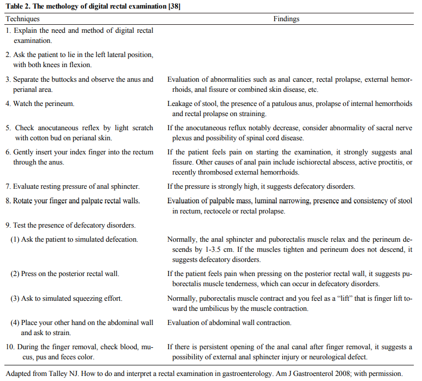 직장 수지 검사는 변비를 진단하는 데 가장 중요한 검사로 직장내 분변, 종괴, 치핵, 치열, 직장 탈출 및 직장류와 같은 이차성 변비의 감별 진단뿐 아니라 배변 장애를 예측하는 데 도움을 준다[13]. 직장 수지 검사 방법은 표 2에 정리하였 다[38]. 요약하면, 부적절한 회음부 하강, 항문조임근 이완이 없거나 역설적 수축이 있다면 배변 장애 가능성을 염두에 두어야 한다. 직장 수지 검사는 배변 장애를 진단하는데 있어서 고식적 항문직장 내압 검사와 고해상도 항문직장 내압 검 사와 비교하여 각각 75% 민감도, 87% 특이도 및 93.2% 민감 도와 91.0%의 양성예측도를 보인다[39,40]. 직장 수지 검사는 정상이더라도 배변 장애를 완전 배제할 수는 없지만, 진료 현장에서 배변 장애에 대한 선별 검사로서 추가적인 항문 직장 기능 검사를 결정하고 치료 방법을 선택하는 데 있어서 손쉽게 시행할 수 있는 효과적인 방법이다[12].