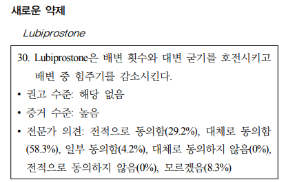 Lubiprostone은 만성 변비 치료제로 미국 식품의약국의 허가를 받은 염소통로 활성제이나, 아직 국내에서의 사용은 불가능하다[15]. 두 개의 무작위 대조군 연구에서 lubiprostone 24 µg을 1일 2회 복용한 경우에 배변 횟수와 대변 굳기가 호전되었고, 힘주기가 감소되었다[92,93]. 부작용은 오심, 설사, 두통, 복부 팽만, 복통, 부글거림, 구토 등이다. Lubiprostone 은 전통적 완하제에 반응하지 않는 정상통과형 변비 혹은 서행성 변비 환자에게 투약해 볼 수 있다.