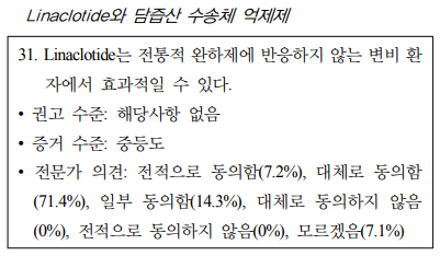 Linaclotide는 2개의 무작위 대조군 연구에서 변비 환자의 자발적 완전 배변 횟수를 증가시켰다[94]. 가장 흔한 부작용은 설사로 대개 투약 첫 2주 이내에 발생한다[94]. Linaclotide 와 담즙산 수송체 억제제는 아직 국내에서 시판되지 않았으나 전통적 완하제에 반응하지 않는 변비 환자에서 효과적일 수 있다[94].