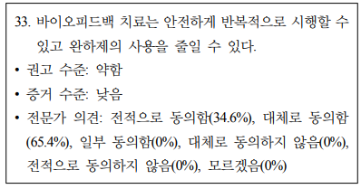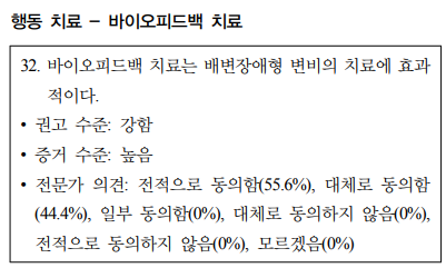 바이오피드백 치료는 배변장애형 변비 환자의 부조화스런 항문직장 근육과 골반 근육들을 재훈련시키는 과정이다. 배변장애형 변비 환자의 약 70% 가량에서 바이오피드백 치료가 효과적이며, 2년 이상 장기간 효과가 지속되지만, 단순 서행성 변비 환자에서는 거의 효과가 없다[95-99]. 배변장애형 변비 환자도 완하제로 치료될 수 있지만, 약제 반응에 관계없이 바이오피드백 치료를 권고하는 것이 바람직하다. 바이오 피드백 치료는 대변 굳기가 더 단단할 수록, 완하제 투약 기간이 짧을수록, 휴식기 항문조임근 압력이 높을수록, 풍선 배출 시간이 길수록 효과적일 것으로 예측된다[100,101]. 또한, 바이오피드백 치료를 받고자 하는 환자의 의지와 순응도가 요구된다.