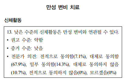 변비 치료에 있어서 신체활동의 효과는 다양하다. 39,532 명의 여성을 대상으로 한 설문조사에서 중등도의 신체활동 을 하는 여성이 앉아서 일하는 젊은 여성, 중년 여성, 노인 여성과 비교하여 의미 있게 낮은 빈도로 변비 증상을 보였다 (각각 odds ratio 0.70, 0.75, 0.82) [48]. 국내 연구에서는 여성의 경우에만 중등도 혹은 고도의 신체활동이 대장 통과 시간을 단축시켰다[49]. 신체활동의 증가는 특히 활동량이 적은 노인의 변비 환자에서 증상 호전을 가져올 수 있지만, 정상 적인 신체활동을 하는 젊은 변비 환자에서의 운동 효과는 명 확하지 않다. 최근 연구에서는 중등도 이상의 신체활동 (20-60분, 주 3-5일)이 과민성장증후군 환자의 증상과 삶의 질을 향상시킨다고 보고하였다[50]. 신체활동의 증가는 삶의 질을 향상시키고 건강상의 이익을 줄 수 있으므로 변비 환자 에게 권고된다.