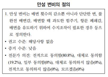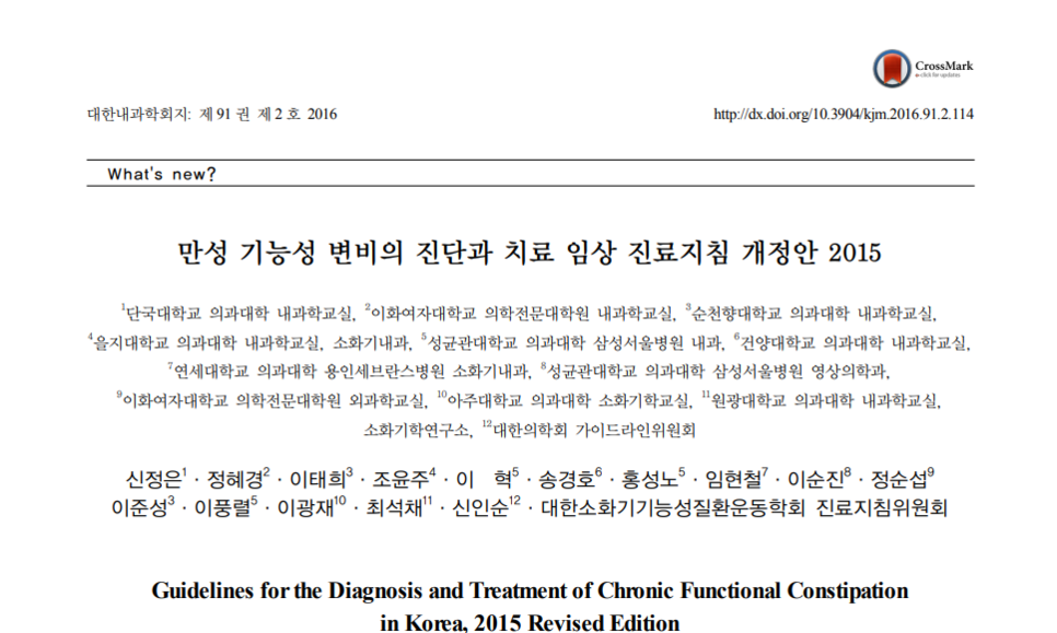 대한소화기기능성질환ㆍ운동학회에서는 2005년에 “변비 진단 및 치료 가이드라인”을 발표하였고[4,5], 2011년 “변비 치료에 관한 임상 진료지침”을 개정 발표하였다[6]. 그 후 새로운 치료제가 국내에 도입되고, 다양한 근거 자료와 함께 유럽과 미국에서 변비 진단 및 치료에 관한 진료지침이 발표 되었다. 또한 이전 지침은 다학제 참여가 부족하였고, 변비의 진단 부분에 대한 지침이 포함되어 있지 않은 제한점이 있다. 이전 진료지침의 보급에도 불구하고 최근 국내 연구에 서 약 25-48% 환자가 변비에 대해 잘못된 인식을 하고 있는 것으로 조사되고 있고[7] 현재 시판되고 있는 완하제의 대부분이 처방전 없이 손쉽게 구입할 수 있어 무분별한 완하제의 사용과 남용이 우려된다. 이러한 이유로 국내 실정에 맞고 실제 임상에서 적용할 수 있는 보다 구체적인 변비의 진단 및 치료에 관한 임상진료 지침에 대한 개정안을 마련하고자 하였다. 만성 기능성 변비의 진단과 치료 임상 진료지침 개정안은 최근 Journal of Neurogastroenterology and Motility 2016년 7월호에 게재되었다[8].