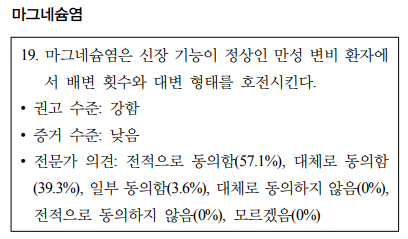 마그네슘염은 삼투성 완하제로 비용이 저렴하고 복용하기 편리한 장점이 있다. 한 연구에서 수산화마그네슘이 부피 형성 완하제와 소비톨을 병합 투여한 군에 비하여 배변 횟수 및 대변 굳기를 호전시키고 추가적인 변비약의 사용 빈도를 유의하게 감소시켰다[60]. 무작위 대조 연구는 매우 드물지만, 마그네슘염은 신장 기능이 정상인 환자에서 배변 횟수를 증가시키고 대변 굳기를 호전시키는 효과가 있는 것으로 여겨져 경도 및 증등도 변비에서 널리 사용되고 있다.