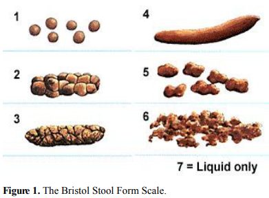 만성 변비를 진단하는 과정에서 배변 횟수뿐 아니라 대변 형태를 관찰하는 것이 중요하다[23,32]. 대변의 성상이 단단해도 배변 횟수는 정상이며 어떤 경우는 대변을 드물게 보아도 형태는 정상인 경우가 있다[33]. 이러한 경우 배변 횟수보다는 대변 형태가 대장 통과 시간과 더 높은 상관성을 보인다. 가장 흔히 사용하는 대변 형태를 관찰하는 척도는 Bristol Stool Form Scale이다(Fig. 1) [32].