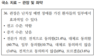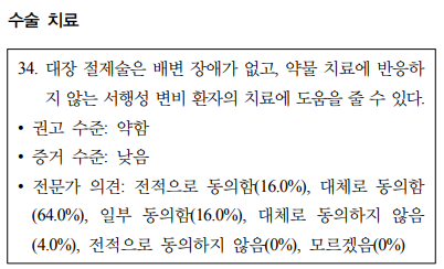 만성 변비에서 수술 치료에 대한 임상 대조 시험은 없으나, 약물 치료에 반응하지 않는 변비 환자에서 수술 치료가 효과적이었다는 증례 보고가 있다. 만성 변비에서 수술의 유효성에 대해 39개 논문, 1,423명의 환자를 대상으로 한 분석 에서 치료 성공률은 86% (39-100%)였다[104]. 전대장절제술 및 회장-직장 문합술이 난치성 변비 환자에서 가장 많이 시술되었고 최근에는 복강경을 이용한 치료와 부분 결장 절제술 등이 시도되고 있다[104,105]. 수술 치료에 앞서 내분비 및 대사 장애, 신경 장애, 근육조직 장애 및 약물에 의한 이차성 변비를 감별하기 위하여 문진, 신체 검진, 혈액 검사, 대장내시경 등의 검사가 필요하다. 배변 장애를 평가하기 위해 바륨 배변 조영술과 항문직장 내압 검사가 필요하며, 서행성 변비를 진단하기 위해 대장 통 과 시간 측정이 필요하다. 상부위장관 운동 장애를 배제하기 위하여 위 배출 검사와 소장 통과 시간 측정도 필요하다 [106]. 수술 치료는 심각한 합병증을 유발할 수 있으므로, 모든 수술 이외의 치료에도 반응하지 않고, 배변 장애가 없는 서행성 변비 환자에서 신중하게 선택적으로 고려해야 한다 [107].