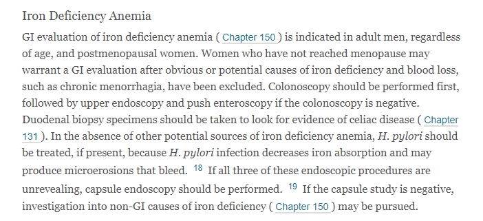 GI evaluation of iron deficiency anemia is indicated in adult men, regardless of age, and postmenopausal women. Women who have not reached menopause may warrant a GI evaluation after obvious or potential causes of iron deficiency and blood loss, such as chronic menorrhagia, have been excluded. Colonoscopy should be performed first, followed by upper endoscopy and push enteroscopy if the colonoscopy is negative. Duodenal biopsy specimens should be taken to look for evidence of celiac disease. In the absence of other potential sources of iron deficiency anemia, H. pylori should be treated, if present, because H. pylori infection decreases iron absorption and may produce microerosions that bleed. If all three of these endoscopic procedures are unrevealing, capsule endoscopy should be performed. If the capsule study is negative, investigation into non-GI causes of iron deficiency may be pursued.