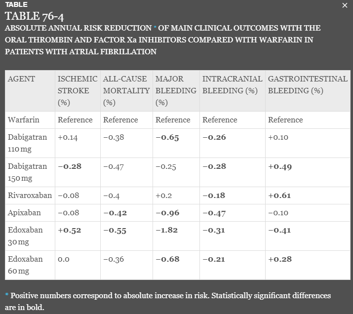 Dabigatran, rivaroxaban, apixaban, and edoxaban are associated with a relative risk reduction of 10% for death and approximately 50% for intracranial hemorrhage compared with warfarin ( Table 76-4 ). Overall, these agents are as or more effective and safer than warfarin for preventing stroke or systemic embolism in patients with atrial fibrillation ; for VTE these agents are probably no more effective than warfarin, but the risk of bleeding is somewhat lower. It is difficult to claim that one direct-acting oral anticoagulant is better than another based solely on indirect comparisons, although some have been better studied in specific types of patients ( Table 76-5 ).