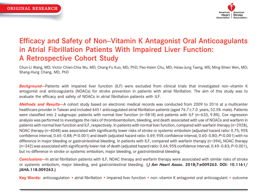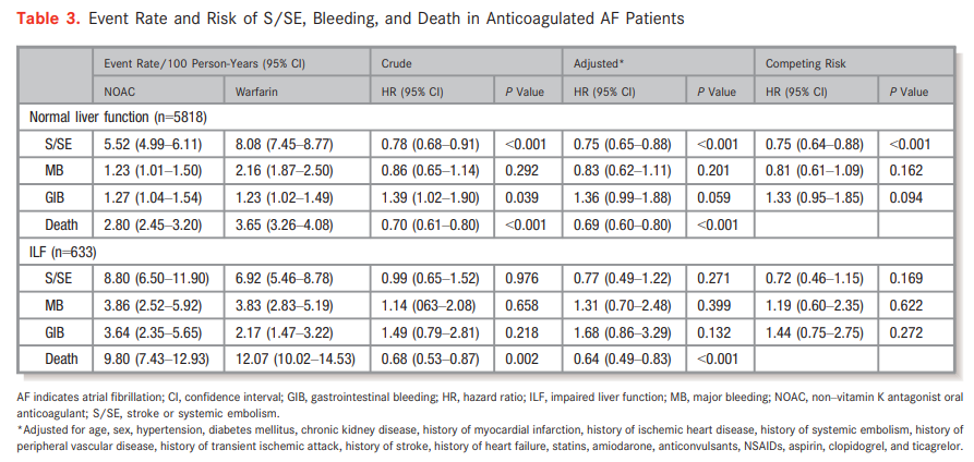 In AF patients with ILF, NOAC therapy was associated with lower risk of death compared with warfarin therapy, but no difference was observed in S/SE, major bleeding, or gastrointestinal bleeding.