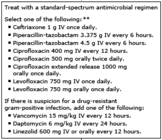 Appropriate regimens include ciprofloxacin 500 mg twice daily, ciprofloxacin 1000 mg extended release once daily, or levofloxacin 750 mg once daily. Fluoroquinolones are given for five to seven days.