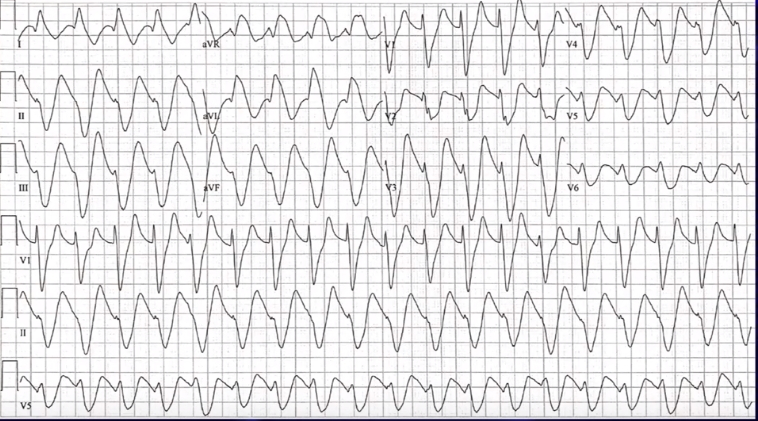 이렇게 really wide QRS tachycardia이고 HR가 120회 정도이면(Vtach은 140-160 이상) 아닐 가능성이 높고(toxic 또는 metabolic condition),