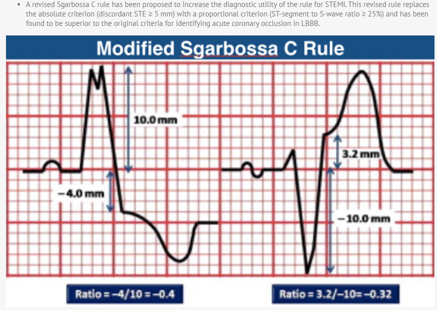 LBBB에서 어떤 leads에서 ST 상승이 1 mm 이상 있으면 Sgarbossa criteria A에 해당하고, V1-V3에서 ST depression이 1 mm 이상 있으면 Sgarbossa B에 해당하며, 이 두 개의 기준은 LBBB에서 AMI 진단에 특이적입니다(A가 B보다 더 특이적). Sgarbossa criteria C는 특이적이지 않아 revised Sgarbossa criteria C가 제안되었고 S파의 길이에 대한 STE 비율이 25 %이상이면 양성이고 원래 기준보다 더 정확합니다.