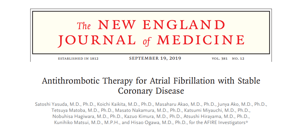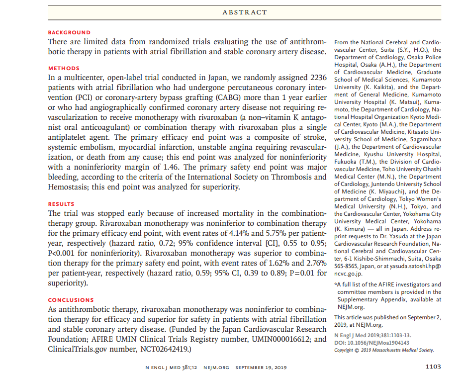 PCI 1년 이후 서구 가이드라인에서는 OAC 단독 치료를 권고합니다. 이 권고는 national Danish cohort study 관찰에 근거하는데 무작위 임상 시험에 의해 지지된 근거는 아닙니다. 다음 AFIRE trial은 revascularization 이후 1년 이상인 안정 관상동맥 질환 또는 관상동맥조영술로 확진된 혈관개통술을 필요로 하지 않는 심방세동 환자에서 항혈전요법을 평가하였습니다. 심혈관 사건과 어떤 원인에 의한 사망 측면에서 리바록사반 단독 치료는 리바록사반과 항혈소판 병합 치료보다 noninferior하며 주요 출혈 측면에서는 우월하다는 것이 결론입니다.