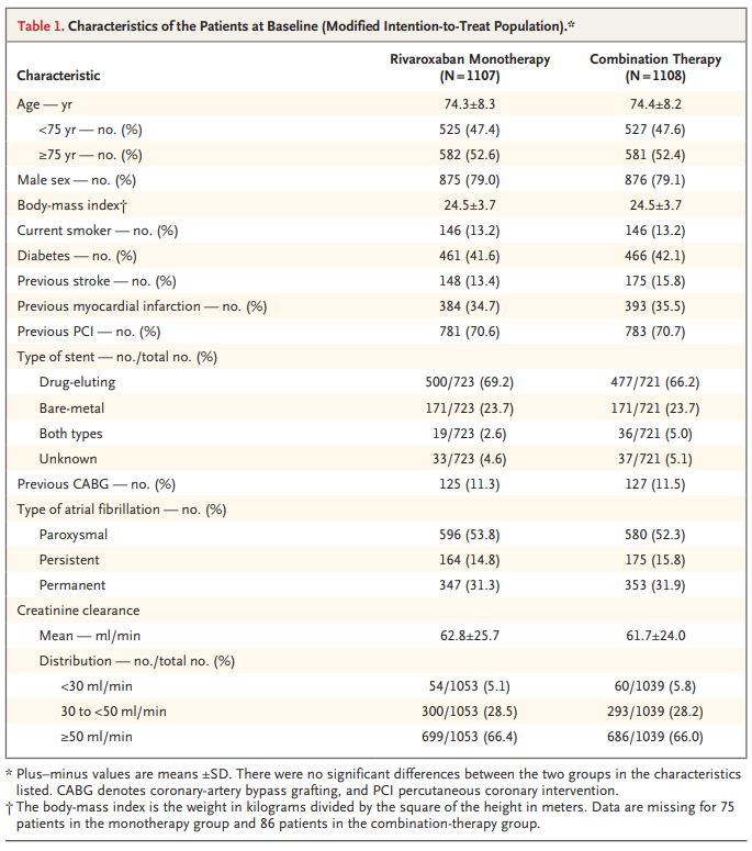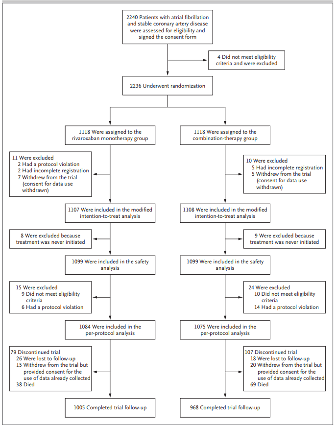 Figure 1. Enrollment, Randomization, and Follow-up. Patients were randomly assigned in a 1:1 ratio to receive monotherapy with rivaroxaban or combination therapy with rivaroxaban plus an antiplatelet agent (either aspirin or a P2Y12 inhibitor). Randomization was performed after adjustment for the following factors with the use of a minimization algorithm: age, sex, history of percutaneous coronary intervention, history of stroke, concomitant heart failure, hypertension, and diabetes mellitus.
