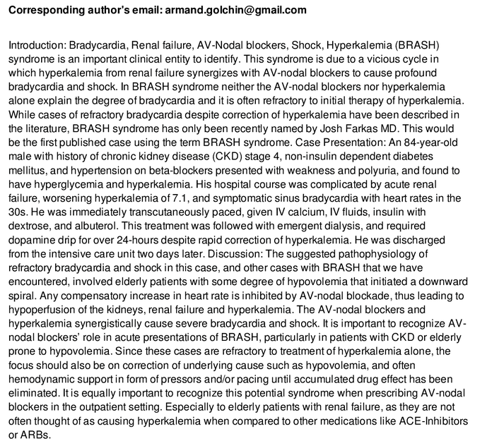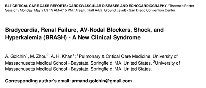 Acute gastroenteritis와 같은 inciting event가 AKI, 과칼륨혈증을 초래하고, 고칼륨혈증이 AV nodal blocking medications와 동반 작용을 하여 서맥과 쇼크를 일으키는 것을 BRASH syndrome이라고 합니다. Hypoperfusion은 신부전과 고칼륨혈증을 더 악화시켜서 vicious cycle을 초래합니다. 치료는 적극적인 혈압 조절, 고칼륨혈증 치료, 원인이 된 질환의 치료입니다.