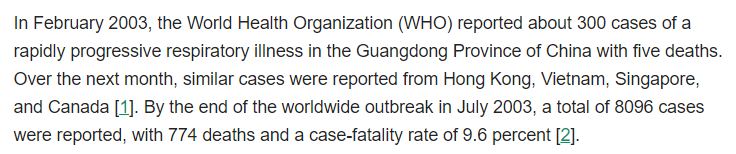 In February 2003, the World Health Organization (WHO) reported about 300 cases of a rapidly progressive respiratory illness in the Guangdong Province of China with five deaths. Over the next month, similar cases were reported from Hong Kong, Vietnam, Singapore, and Canada. By the end of the worldwide outbreak in July 2003, a total of 8096 cases were reported, with 774 deaths and a case-fatality rate of 9.6 percent.
