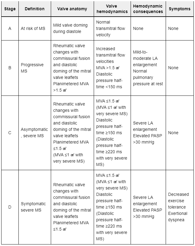 ㉲ 심한 증상이 있는(NYHA class III 또는 IV) severe MS (MVA ≤1.5 ㎠, stage D) 환자가 percutaneous intervention 대상자이지만 다른 이유(예, aortic valve disease, coronary artery disease, tricuspid regurgitation, aortic aneurysm)로 cardiopulmonary bypass 수술을 한다면 mitral valve surgery를 제안합니다. ㉳ 이외의 다른 이유로 일부 환자에서 intervention이 제안되기도 하지만 의대생, 전공의 수준 이상이므로 기술을 생략합니다.