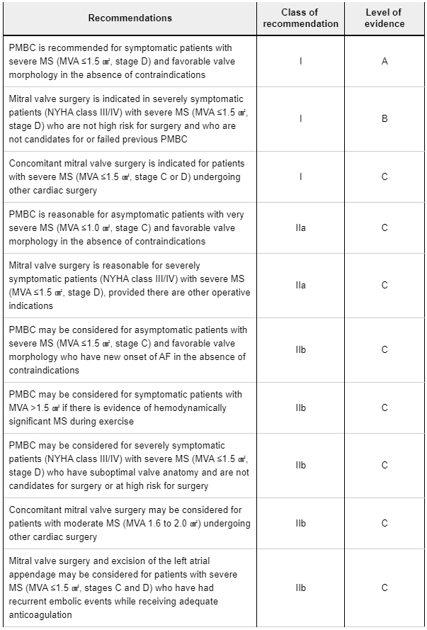 ㉮ 증상이 있는 severe MS (MVA ≤ 1.5 ㎠, stage D) 환자에서 percutaneous mitral balloon valvotomy(PMBC)를 권고(recommend)합니다. Favorable valve morphology이고 left atrial thrombus와 moderate to severe MR이 없어야 합니다.