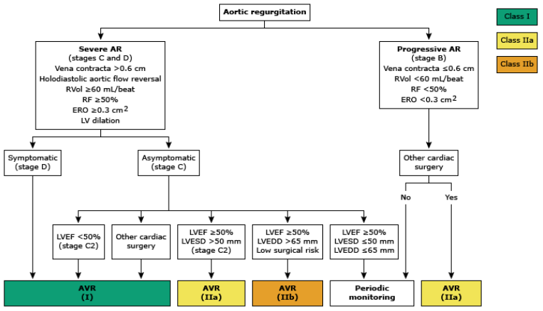 AR: aortic regurgitation; AVR: aortic valve replacement (valve repair may be appropriate in selected patients); ERO: effective regurgitant orifice; LV: left ventricular; LVEDD: left ventricular end-diastolic dimension; LVEF: left ventricular ejection fraction; LVESD: left ventricular end-systolic dimension; RF: regurgitant fraction; RVol: regurgitant volume.