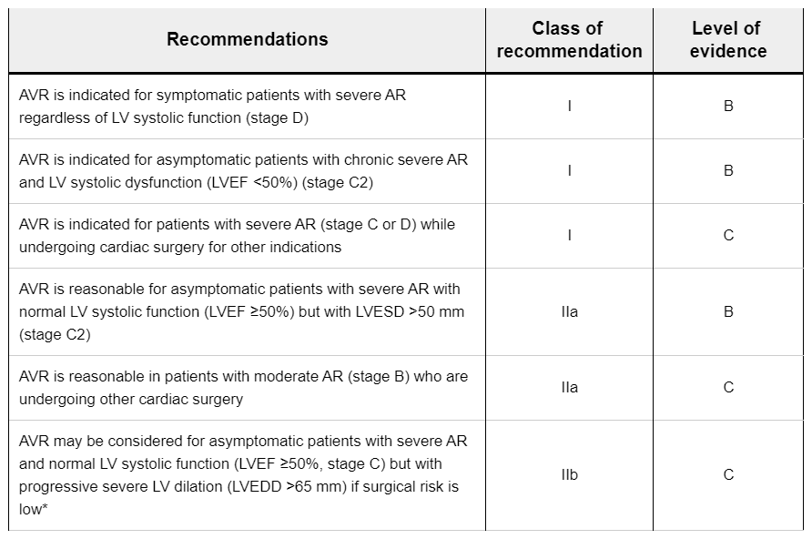 Aortic valve surgery (주로 aortic valve replacement)는 symptomatic severe AR과 일부 asymptomatic AR 환자의 주된 치료입니다. Moderate 또는 severe AR 환자들에서 aortic valve surgery의 적응증이 되는지 주기적 추적관찰을 해야 합니다. Chronic AR의 aortic valve surgery에 대한 다음 권고사항은 2014 American Heart Association/American College of Cardiology (AHA/ACC) valve guidelines Chronic AR의 aortic valve surgery에서 채택한 것입니다.