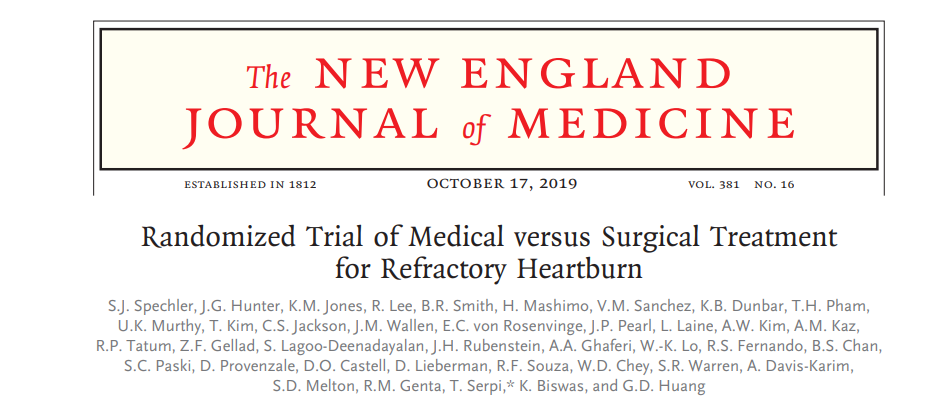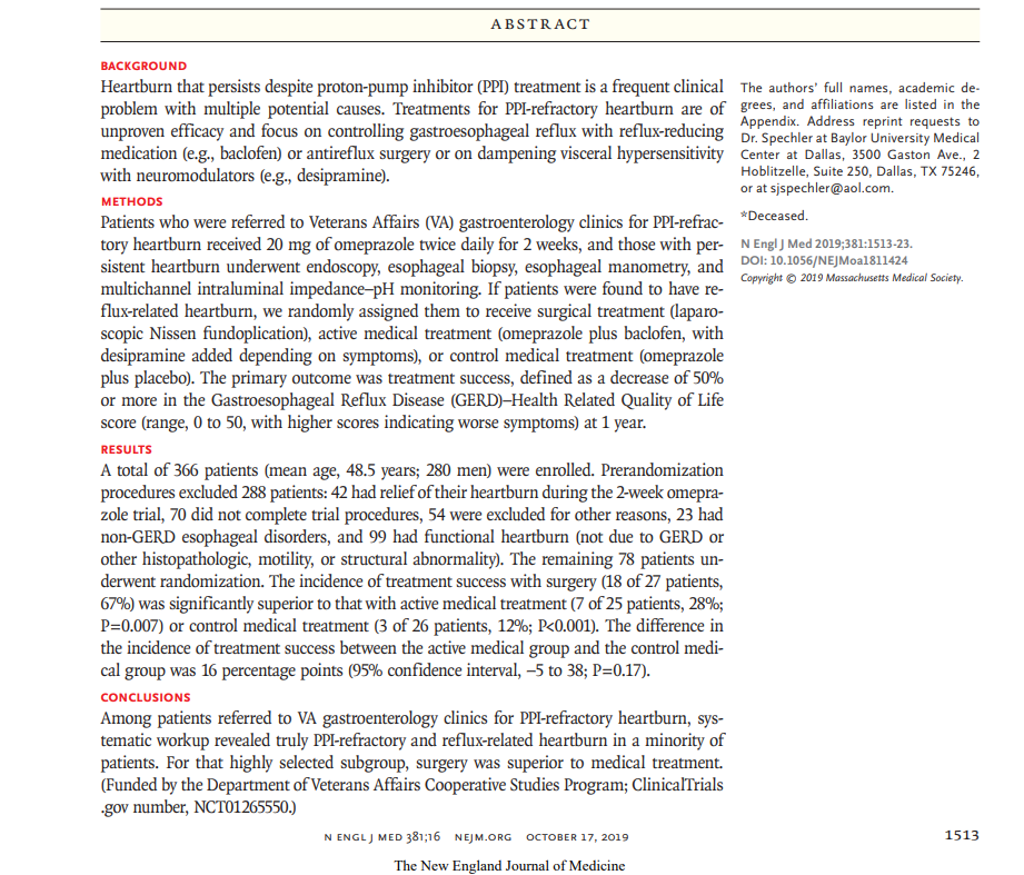 Surgical versus medical therapy for heartburn refractory to proton-pump inhibitors (October 2019)