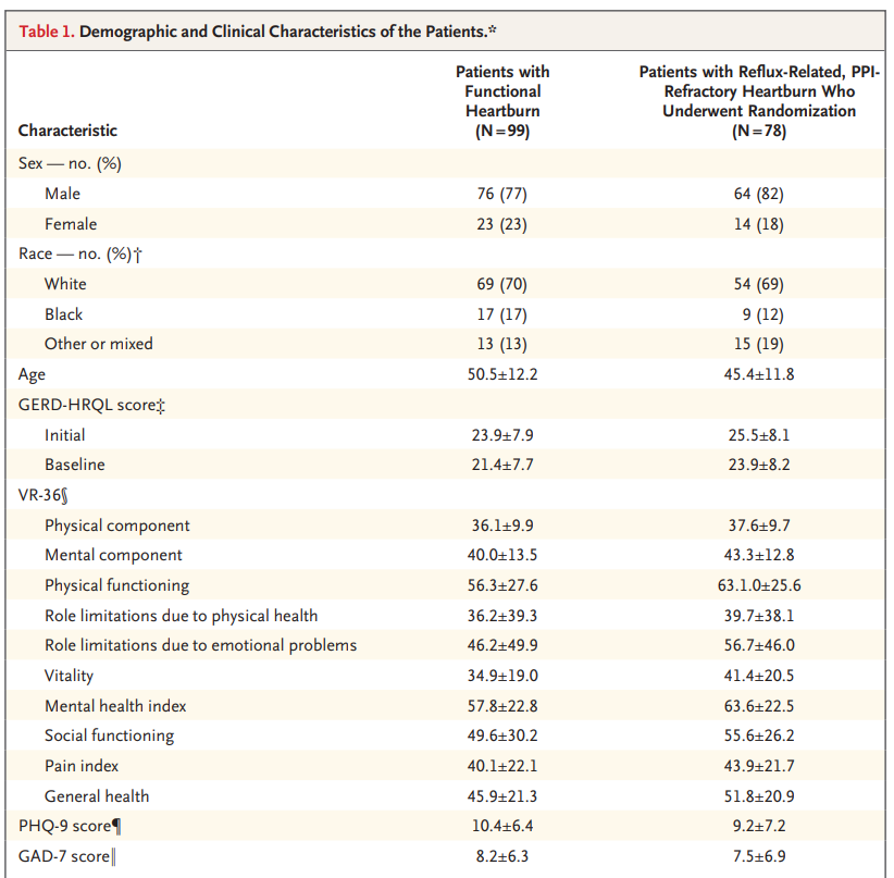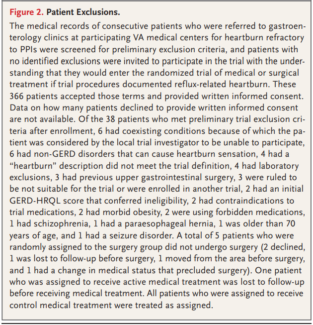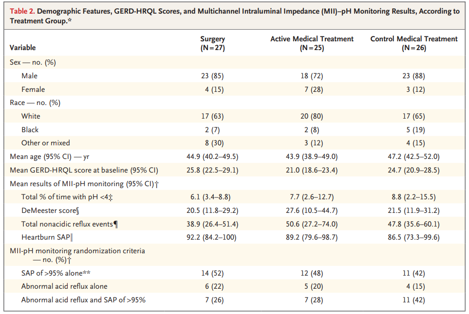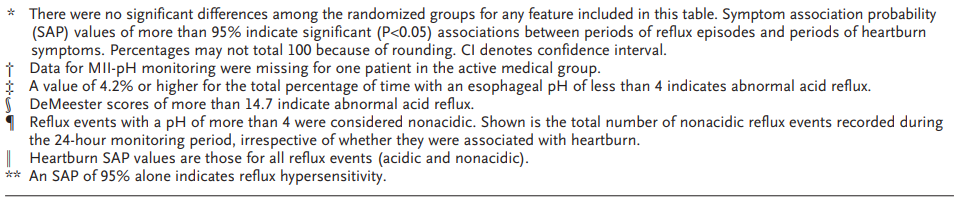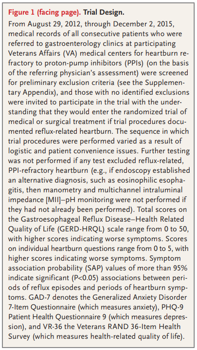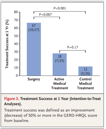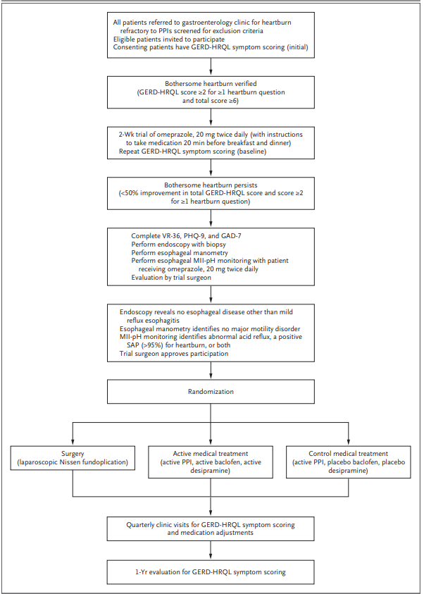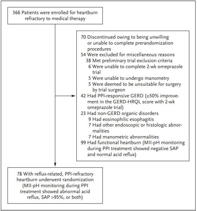 The optimal approach to heartburn refractory to proton-pump inhibitors (PPI) is debated. In a randomized trial, patients with heartburn refractory to a two-week course of double-dose omeprazole underwent endoscopy, esophageal biopsy, esophageal manometry, and multichannel intraluminal impedance-pH monitoring while on PPI therapy. One-fifth had objective evidence that their symptoms were related to gastroesophageal reflux disease (GERD) and were randomly assigned to receive laparoscopic Nissen fundoplication, active medical management (omeprazole+baclofen±desipramine), or control medical management (omeprazole+placebo). At one year, the proportion of patients in the surgery, active medical, and control medical management groups that achieved ≥50 percent improvement in a GERD quality of life score was 67, 28, and 12 percent, respectively. These results support the efficacy of antireflux surgery, but also underscore the importance of careful patient selection, as 79 percent of patients referred for PPI-refractory heartburn lacked objective evidence of GERD.