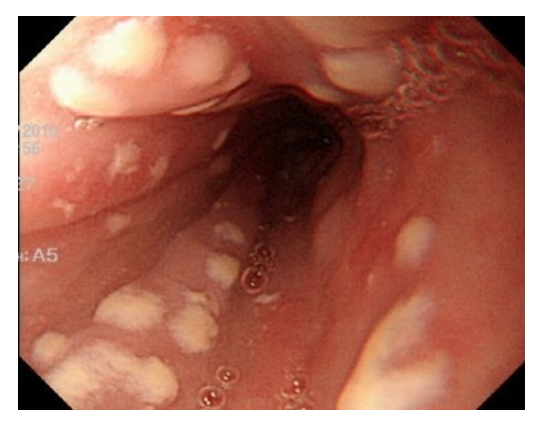 음식을 삼킬 때마다 발생하는 흉통으로 내원하였고 내시경 사진에서 white mucosal plaque-like lesions이 보이므로 진단은 candida esophagitis입니다. Esophageal candidiasis의 hallmark는 odynophagia(pain on swallowing)입니다. 진단은 보통 내시경에서 보이는 white mucosal plaque-like lesions으로 합니다. Candida esophagitis는 systemic antifungal therapy를 필요로 하며 local agents로 치료해서는 안됩니다. Odynophagia 또는 dysphagia 증상이 있는 면역이 억제된 환자에서는 경험적 항진균제가 적절합니다. 약물 투약 72 시간 이후에도 증상이 개선되지 않으면 위내시경을 시행해 볼 수 있습니다. Oral thrush가 없는 환자에서는 위내시경 검사에 대한 역치가 더 낮습니다. 그 이유는 다른 원인들이 환자의 증상을 일으킬 수 있기 때문입니다. 일반적인 치료기간은 14-21일입니다. 초기 IV 제제는 경구 치료를 할 수 없는 중증 질환 환자에서 필요할 수 있습니다. Esophageal candidiasis 치료제는 azoles, echinocandins, amphotericin B입니다. 치료 효과 우수성, 투약 용이성, 낮은 비용으로 인하여 칸디다 식도염 치료로서 플루코나졸(loading dose 400 mg, 유지용량 200-400 mg, PO 또는 IV)을 권고합니다. 플루코나졸 1주 치료 이후에도 재발한 입증된 칸디다 식도염 환자에서는 voriconazole, posaconasole을 권고합니다. 이트라코나졸 oral suspension (200 mg) 또한 효과적이지만 오심을 더 일으킬 수 있습니다. IV 치료가 필요한 환자에서는 amphotericin B보다는 다소 echinocandin을 제안합니다(amphotericin B가 더 독성이 있습니다). AIDS나 암환자가 아닌 면역이 있는 환자에서는 보통 외래에서 경구 약제로 치료하고, 면역이 억제된 중증의 상태나 경구약제로 호전되지 않는 경우에는 IV 약제를 사용합니다.