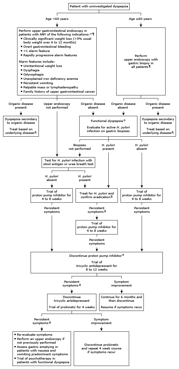◊ Patients with continued symptoms of dyspepsia for 3 months with symptom onset at least 6 months before diagnosis and no evidence of structural disease to explain the symptoms should be diagnosed and treated as functional dyspepsia.