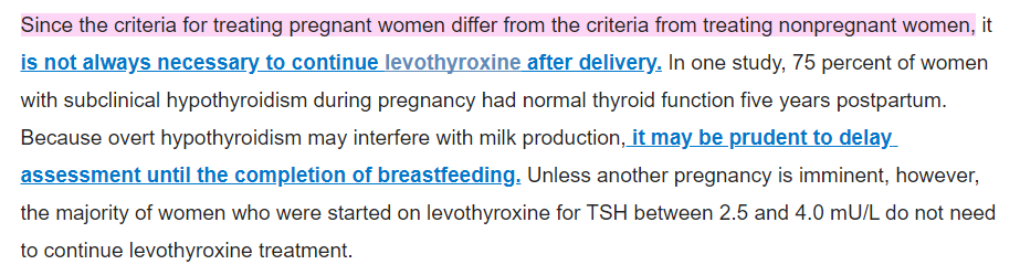 비임신 여성에 대한 치료 기준과 임신 여성 치료 기준은 다르기 때문에 출산 이후에 갑상선호르몬 복용이 항상 필요한 것은 아닙니다. TSH 2.5 ~ 4.0 mU/L에서 갑상선호르몬 투약을 했던 대부분의 여성들은 갑상선호르몬 복용이 필요하지 않습니다