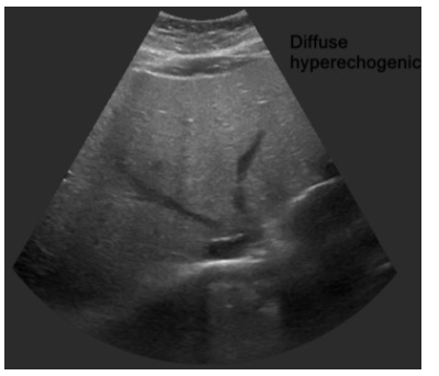 간초음파 사진의 diffusely increased echogenicity는 지방간 소견입니다.정상 hepatic vein의 wall은 liver parenchyme보다 hyperechoic하지만 사진의 hepatic vein wall은 isoechoic하며 parenchyme의 echogenicity가 증가되어 있음을 알 수 있습니다.