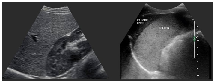 ② 정상 liver echotexture는 homogenous echogenicity를 보이며 renal cortex와 비교할 때 약간 echogenicity가 증가되어 보이고 (아래 왼쪽 사진), spleen과 비교할 때 hypoechoic하게 보입니다 (아래 오른쪽 사진).