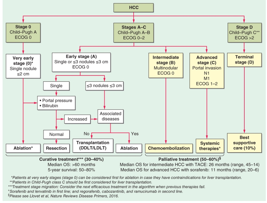 BCLC staging system and therapeutic strategy. BCLC classification comprises five stages that select the best candidates for therapies according to evidence-based data. Patients with asymptomatic early tumors (stages 0–A) are candidates for radical therapies (resection, transplantation, or local ablation). Asymptomatic patients with multinodular HCC (stage B) are suitable for transcatheter arterial chemoembolization (TACE), whereas patients with advanced symptomatic tumors and/or an invasive tumoral pattern (stage C) are candidates to receive sorafenib. End-stage disease (stage D) includes patients with poor prognosis that should be treated by best supportive care.