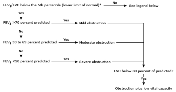 천식 진단에서 가장 중요한 것은 airflow limitation에 대한 검사입니다. Spirometry로 FEV1과 FVC를 측정하고 이것은 천식 진단에 중요한 정보를 제공합니다. Spirometry 결과로 알 수 있는 것은 FEV1/FVC ratio, 기관지 확장제 투여 후 반복적인 spirometry 측정으로 obstructive abnormality의 reversibility 평가, normal predicted value에 대한 FEV1 %에 근거한 airflow limitation의 중증도, normal FEV1/FVC ratio인 환자에서 restrictive pattern 확인 (예, FVC < 80 % predicted)입니다. Spirometry에서 obstructive pattern은 FEV1/FVC 감소로 확인하며 0.70보다 낮으면 airflow obstruction이 있는 것입니다. FEV1/FVC ratio가 정상 또는 증가하면 expiratory airflow obstruction은 없습니다. FEV1/FVC 감소로 airflow obstruction 존재가 확인되면 airflow obstruction 중증도는 정상보다 낮은 FEV1 감소 정도에 의해 구분됩니다.