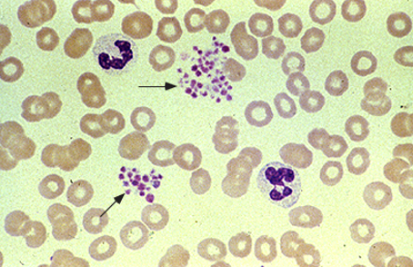 This peripheral blood smear shows platelet clumping (arrows) in an EDTA-anticoagulated blood sample. This patient had an EDTA-dependent platelet agglutinin that caused in vitro platelet clumping, resulting in an artifactually low platelet count (ie, "pseudothrombocytopenia"). No platelet clumping was seen, and the platelet count was normal, in a blood sample from this patient anticoagulated with sodium citrate.