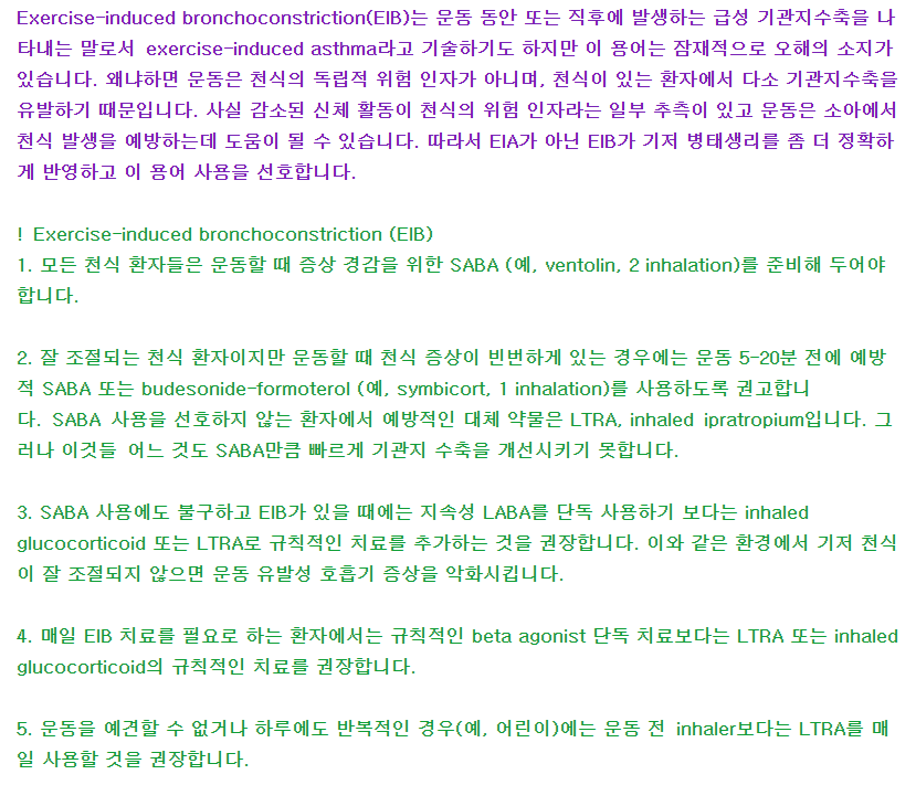 EIB의 병태생리 이해가 개선되면서 중증도를 줄이는 일반적 권고를 도출하였습니다. 첫 번째는 minute ventilation의 강도를 줄이는 것이고 두 번째는 inspired air의 온도와 습도를 높이는 것입니다. 환자의 cardiovascular fitness를 개선시키는 것은 운동 수준을 위해 요구되는 minute ventilation을 줄이며 기관지수축 자극을 줄입니다. 유사하게 흡입 공기의 습도가 높아지고 더 따뜻해지면 기관지 수축이 감소됩니다. 구강호흡은 비강호흡보다 공기가 더 건조해지며 충분한 준비운동은 cardiovascular fitness를 개선시킵니다.