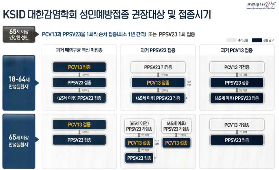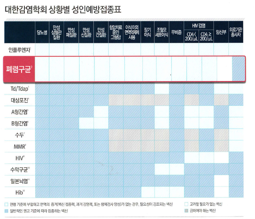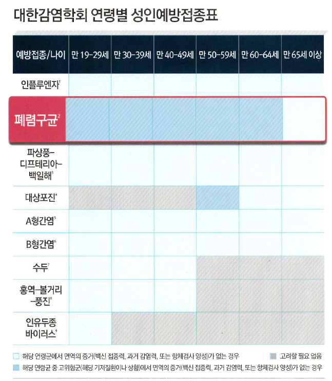 대한감염학회 성인예방접종 권장대상 및 접종시기