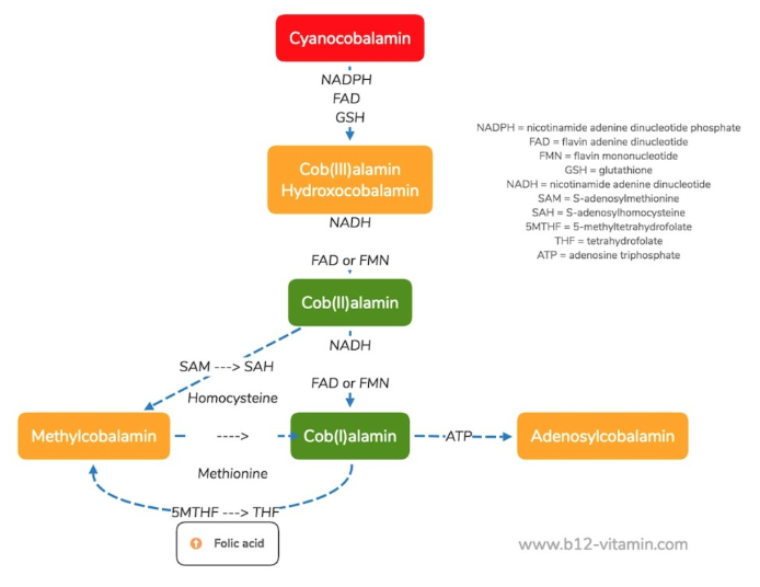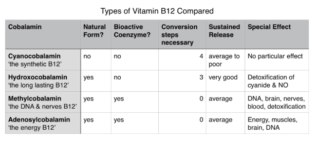 비타민 B12의 형태는 4가지 cyanocobalamin, hydroxocobalamin , methylcobalamin, adenosylcobalamin이 있고 자연에서 얻을 수 있는 것은 methylcobalamin, adenosylcobalamin, hydroxocobalamin입니다. Bioactive form은 methylcobalamin, adenosylcobalamin이고 cyanocobalmain은 상업적 제제로 흡수하지만 이것 자체로 특별한 효능이 있는 것이 아니라 효능을 나타내기 위해서는 hydroxocobalamin , methylcobalamin, adenosylcobalamin으로의 변환이 필요합니다.