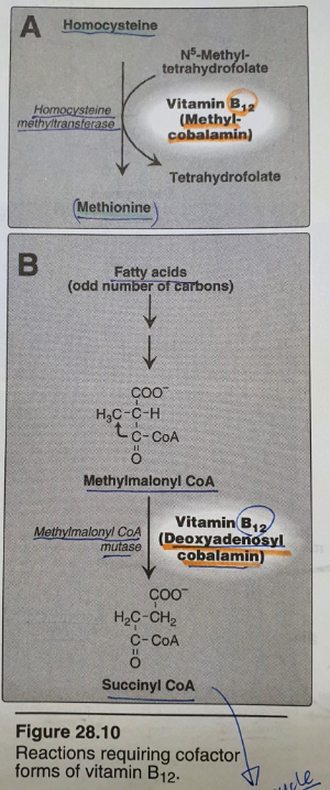 사람 조직에서 cobalamin을 필요로 하는 두 반응을 앞에서 설명하였습니다. A 반응은 cytosol에서 일어나며 여기서 필요한 것은 methylcobalamin입니다. B 반응은 mitochondria에서 일어나고 여기서 필요한 것은 dyoxyadenosylcobalamin입니다.