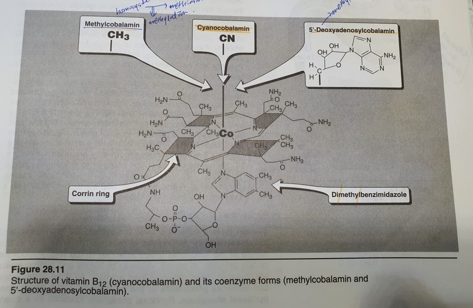 ! Vitamin B12의 coenzyme forms에는 5'deoxyadenosylcobalamin과 methylcobalamin이 있습니다.