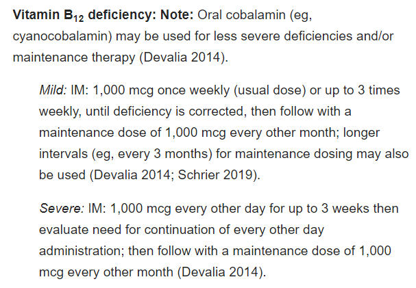 ! 비타민 B12 결핍 치료는 ① 히드록시코발라민 또는 ② 코발라민 또는 ③ methylcobalaminl과 adenosylcobalamin의 조합으로