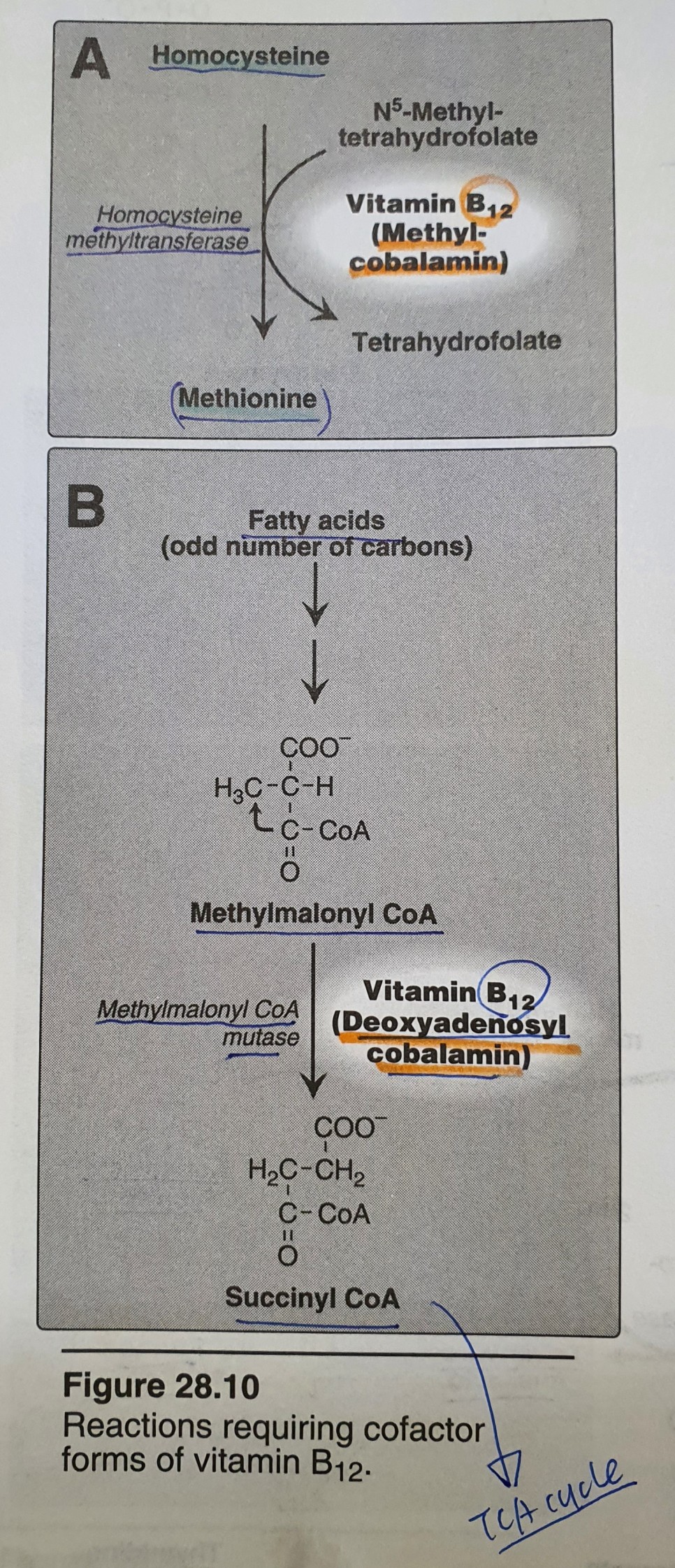 사람 조직에서 cobalamin을 필요로 하는 두 반응을 앞에서 설명하였습니다. A 반응은 cytosol에서 일어나며 여기서 필요한 것은 methylcobalamin입니다. B 반응은 mitochondria에서 일어나고 여기서 필요한 것은 dyoxyadenosylcobalamin입니다.