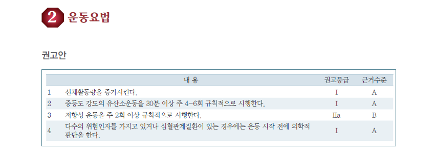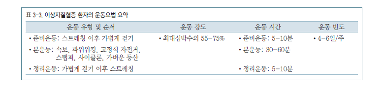이상지질혈증의 조절을 위한 특별한 운동처방은 없으며, 일반적으로 심혈관계질환을 예방하기 위한 방법과 같다. 일반적으로 중등도 강도로 주 5회 30분 이상 또는 고강도로 주 3회 20분 이상 유산소 운동을 권장한다. 운동빈도는 최대한 칼로리 소비를 위해 주 4–6일 정도 실시해야 하며, 운동강도는 나이에 따른 최대 심박수(=220-나이)의 55–75% 범위로 하는 것이 좋으며 이는 중등도 강도에 해당한다(표 3-3). 그러나 심박수를 현저히 낮추는 베타차단제나 nondihydropyridines 계통의 칼슘채널차단제를 복용하는 심혈관질환자는 최대심박수를 구하는 [220-나이] 공식에 목표심박수(40–85%)를 적용하는 것은 금물이다. 이러한 환자들은 최대운동 시 심박수 증가가 현저하지 않기 때문에 주의가 필요하다. 따라서 심혈관질환이 있는 환자는 반드시 운동부하검사를 통해 정확한 강도를 설정하는 것이 좋으나 운동부하검사를 받지 않았을 경우, “보통이다”라는 느낌으로 시작하여 “약간 힘들다”라는 느낌으로 운동을 유지하는 것이 좋은 방법이다. 운동시간은 준비운동을 10분 정도 하되 5분간 가벼운 스트레칭을 시작으로 5분간 가볍게 걷기까지가 준비운동이며, 본운동으로 들어가서 트레드밀을 할 경우 30–60분을 하되 체중감량을 포함한 운동을 할 경우 50–60분을 유지해야 한다(주당 2,000 kcal 이상). 이때 한꺼번에 운동시간을 채우기 힘들 경우 최소 10분씩 운동을 여러 번 나누어서 하고 중간에 2–3분간 가볍게 걸으면서 휴식을 취한다. 운동유형은 주로 대근육을 리드미컬하게 움직이는 걷기, 파워워킹, 자전거 같은 유산소 운동이 추천된다. 주당 칼로리 소비량은 1,000–2,000 kcal 정도 되어야 한다.