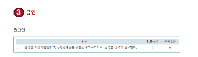 따라서 이상지질혈증과 심혈관계질환 예방을 위하여 금연을 적극 권장한다.