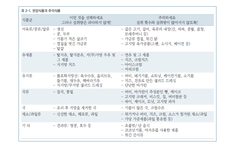 이에 우리나라 식생활에 맞는 주요 식품군의 권장식품과 주의식품을 정리하면 표 3-1과 같다.